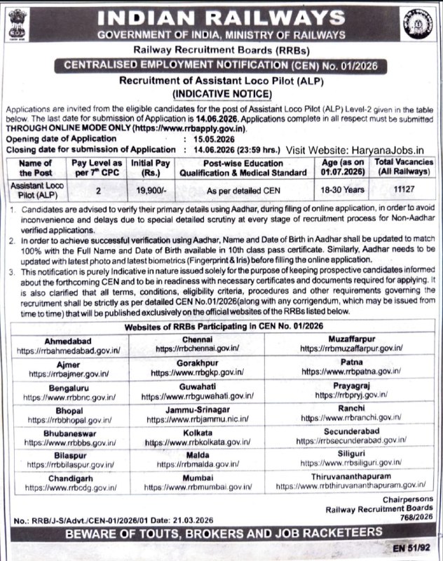 Railway Recruitment Board (RRB) has officially released the short notice for RRB ALP Recruitment 2026 (CEN 01/2026). There are approximately 11,127 vacancies available for the post of Assistant Loco Pilot. Interested candidates can apply online at sarkariformzone.com starting from May 15, 2026.
